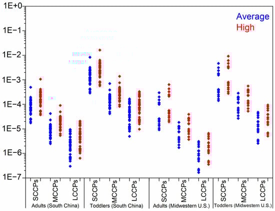 The hazard quotient for toddlers and adults from South China and Midwestern U.S. exposure to SCCPs, MCCPs, and LCCPs under average- and high-exposure scenarios.