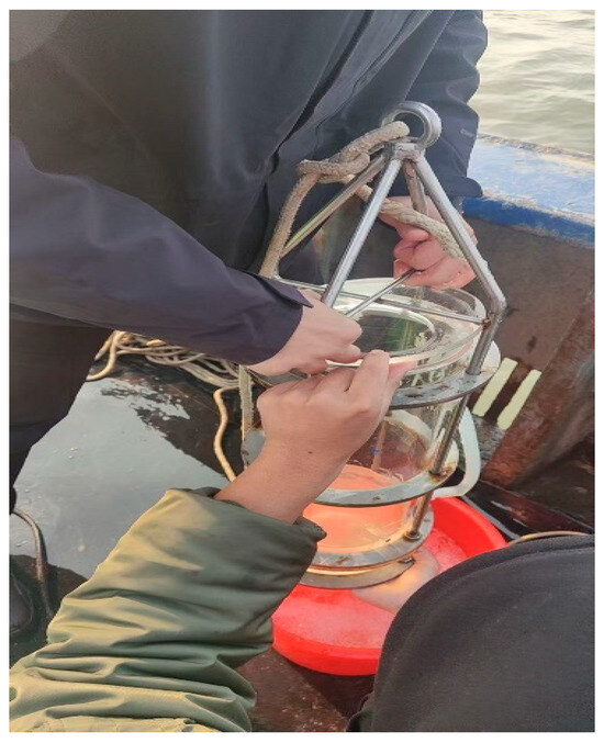 The microplastic (PVC) samples were obtained from Xutai Microplastic Co. (Dongguan, China), with particle sizes of 50 µm, 100 µm, and 150 µm. PVC, a high-density polymer, was chosen due to its widespread use, environmental persistence, and strong adsorption potential for radionuclides. Prior to the experiment, all microplastic samples were cleaned using deionized water and an ultrasonic cleaner to remove surface impurities. The water samples were collected from four sampling points around the Tianwan Nuclear Power Plant (Lianyungang, China) (Figure 1) using a glass water sampler (Denuo Co., Xinxiang, China), which could be opened and closed at a specific depth (Figure 2). At each point, 10 L of water was collected from both the surface and bottom layers, with depth variations depending on the location. At sampling point 4 (depth: 23 m), 10 L of water was collected from the surface and the bottom layer at 20 m. At sampling point 3 (depth: 13 m), 10 L was collected from the surface and the bottom layer at 12 m. At sampling point 2 (depth: 6 m), 10 L was taken from both the surface and the bottom layer at 6 m. At sampling point 1 (depth: 4 m), 10 L of water was collected from the surface and the bottom layer at 4 m (Table 1). Immediately after collection, the water samples were filtered using a 20 cm, 800-mesh stainless steel sieve to remove large particulate impurities and stored in clean glass containers. The collected natural water samples were stored at −4 °C for 24 h before further analysis.