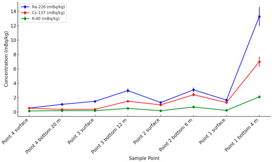 - Point 3: Ra-226 = 6.14 mBq/L, Cs-137 = 2.59 mBq/L, K-40 = 1.28 mBq/L;