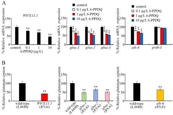 Effect of 6-PPDQ exposure on glutamate synthesis. (A) Effect of 6-PPDQ exposure on expression of genes governing glutamate synthesis. ** p < 0.01 vs. control. (B) Effect of RNAi of W07E11.1, glna-1, glna-2, glna-3, and alh-6 on glutamate content in 6-PPDQ-exposed nematodes. Exposure concentration of 6-PPDQ was 10 μg/L. ** p < 0.01.