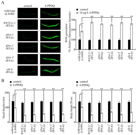 Effect of RNAi of W07E11.1, glna-1, glna-2, glna-3, and alh-6 on 6-PPDQ toxicity in causing ROS generation (A) and decrease in locomotion (B). Exposure concentration of 6-PPDQ was 10 μg/L. ** p < 0.01.