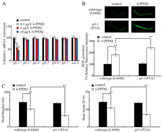 Effect of 6-PPDQ exposure on expression of glutamate transporter genes. (A) Effect of 6-PPDQ exposure on expression of eat-4, glt-1, glt-3, glt-4, glt-5, glt-6, and glt-7. ** p < 0.01 vs. control. (B) Effect of RNAi of glt-1 on 6-PPDQ toxicity in causing ROS generation. Exposure concentration of 6-PPDQ was 10 μg/L. ** p < 0.01. (C) Effect of RNAi of glt-1 on 6-PPDQ toxicity in decreasing locomotion. Exposure concentration of 6-PPDQ was 10 μg/L. ** p < 0.01.