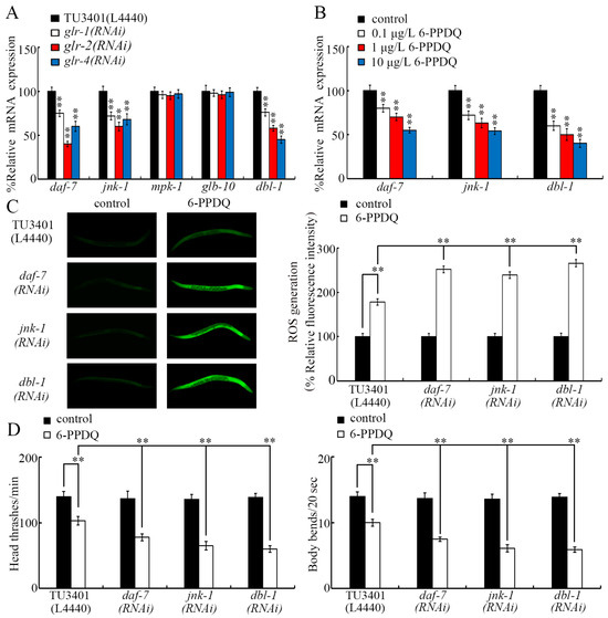 GLR-1, GLR-2, and GLR-4 are predominantly expressed in neurons (https://wormbase.org). Regarding pollutant toxicity, some molecular signals (DAF-7, JNK-1, MPK-1, GLB-10, and DBL-1) act in the neurons to carry out their functions [48]. After 6-PPDQ exposure, the expression of daf-7, jnk-1, and dbl-1 was suppressed by neuronal RNAi of glr-1, glr-2, and glr-4, but the expression of mpk-1 and glb-10 was not changed by neuronal RNAi of glr-1, glr-2, and glr-4 (Figure 6A). Meanwhile, 6-PPDQ (0.1–10 μg/L) decreased daf-7, jnk-1, and dbl-1 expression, and this decrease in their expression was concentration-dependent (Figure 6B). Moreover, the ROS generation and inhibition of locomotion induced by 6-PPDQ were strengthened by neuronal RNAi of daf-7, jnk-1, and dbl-1 (Figure 6C,D).