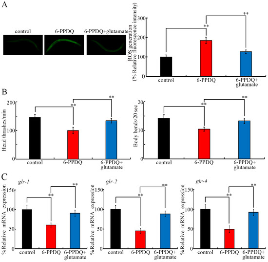 Effect of glutamate (5 mM) treatment on toxicity induced by 6-PPDQ (10 μg/L). (A) Effect of glutamate treatment on ROS generation in 6-PPDQ-exposed nematodes. (B) Effect of glutamate treatment on locomotion in 6-PPDQ-exposed nematodes. (C) Effect of glutamate treatment on expression of glr-1, glr-2, and glr-4 in 6-PPDQ-exposed nematodes. ** p < 0.01.