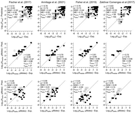 | Valdiviezo et al. [28] | Pesticides (n = 20) | No cell | Ratio of response ratios measured from free media and initial exposure media |