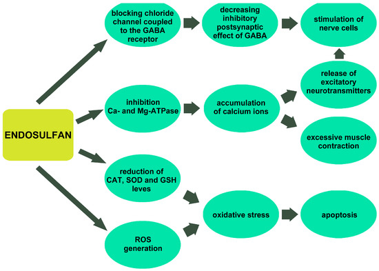 Endosulfan is called a non-competitive γ-aminobutyric acid (GABA) antagonist [67]. It does not bind directly to the GABA binding site. Instead, it binds to the chloride channel coupled to the GABA receptor, blocking it. In this way, it inhibits GABA attachment to its receptor [1]. Physiologically, GABA binding to its receptors causes an influx of chloride ions into neurons, which in turn causes hyperpolarization of cell membranes and, as a result, reduces neuronal excitability. Endosulfan decreases the inhibitory postsynaptic effect of GABA at its receptor. This leads to uninhibited stimulation of nerve cells [1,68,69]. In addition, endosulfan can inhibit Ca- and Mg-ATPases, which leads to the accumulation of calcium ions and causes excessive release of excitatory neurotransmitters [1]. Moreover, endosulfan may cause oxidative stress by inducing reactive oxygen species (ROS) and membrane lipid peroxidation [70]. Endosulfan-induced oxidative stress activates caspase 3 and NFkβ, which may lead to apoptosis [14]. Endosulfan has been shown to significantly reduce glutathione content in a dose-dependent manner in human peripheral blood mononuclear cells (PBMC) in vitro, demonstrating a close correlation between oxidative stress and the degree of apoptosis [71,72]. Oxidative stress can cause irreversible cellular component modification, leading to damage or even cell death [2,73]. Figure 1 schematically illustrates mechanisms of endosulfan toxicity.