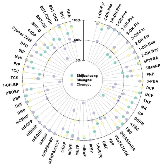 Detection frequency of target analytes in the urine of pregnant women from three cities. Only the compounds with an overall detection frequency > 50% in all subjects are included. Point overlap exists if the compounds display the same detection rate, e.g., mEHHP has a detection frequency of 100% in all three cities.