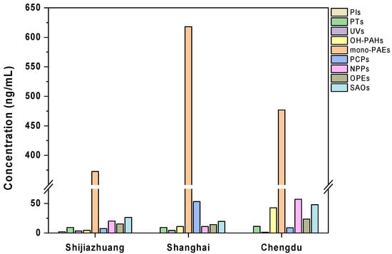 Multiple bar chart showing the concentrations of nine groups of exogenous chemicals in the urine of pregnant women in each city. Mono-PAEs, monophthalate esters; SAOs, synthetic antioxidants; OPEs, organophosphate esters; NPPs, non-PAE plasticizers; PCPs, personal care products; OH-PAHs, hydroxy polycyclic aromatic hydrocarbons; UVs, UV stabilizers; PTs, pesticides; PIs, photoinitiators.