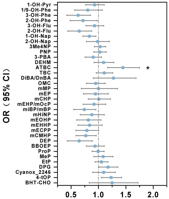 Further logistic regression analysis explored the association between early gestational exposure to environmental chemicals and the GDM risk, after adjustment with potential covariates. The results revealed a significant and positive association between urinary levels of ATBC and GDM risk (OR = 1.46; 95% CI: 1.03, 2.08), (Figure 3, Table S7). Some other substances showed a positive, but not statistically significant, association with GDM.
