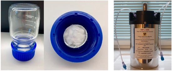 Elution of VMT-α-GEN was performed with 4 mL of 2 M HClsuprapure, followed by 4 mL of air and an additional 1 mL of H2Osuprapure in order to wet the generator and avoid further 220Rn release from the generator.