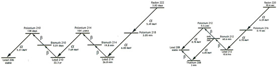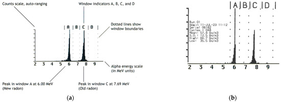 For the detection and measurement of 220Rn, an electronic radon detector (RAD7, DURRIDGE, Billerica, MA, USA) was used. The interworking of the RAD7 consisted of a solid-state, ion-implanted, planar, silicon-alpha detector housed within a 0.7 L hemisphere. The RAD7 specifically detects the alpha energies of 218Po (t1/2 = 3.05 min, 6.00 MeV, channel A) and 216Po (t1/2 = 0.15 s, 6.78 MeV, channel B) as decay products from 222Rn (t1/2 = 3.82 d) and 220Rn, respectively, which can be used to quantify the concentration of each of these Rn isotopes (Figure 2). For our measurements relevant here, due to the short half-life of 216Po, the response of the RAD7 to 220Rn is virtually instantaneous, while the response to 222Rn will take 15 min for the count rate to reach equilibrium. The upper limit of the RAD7 is 1 MBq/m3. The original tubing from the manufacturer was used, as the detector was calibrated to the length of the tubing.