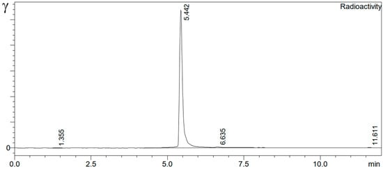 Finally, the product was purified by using a C18 Plus light cartridge (WAT023501, Waters, Eschborn, Germany) preconditioned with 1 mL of EtOH and 3 mL of H2O (wet condition). The cooled and diluted product solution (4 mL of 0.9% NaCl) was slowly passed through the C18 cartridge. The C18 cartridge containing the product was rinsed with 2 mL of 0.9% NaCl solution and was directly eluted with 1 mL of 50% EtOH for injection directly through a vented sterile filter (0.22 µm, SLGVV255 F, Millex-GV, Merck-Millipore) into a product vial. Finally, the product was diluted with 7 mL of 0.9% NaCl solution. The radiochemical yield for 212Pb-VMT-α-NET and 212Pb-PSV-402 were >95%, and the radiochemical purities were >99% (Figure 3), respectively.