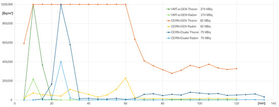 No 220Rn emanation was detected when the generators were stored within the fume hood (wet storage for VMT-α-GEN and dry for CERN generator) and without use. The concentrations of 220Rn and 222Rn in Bq/m3 over the time of handling for both generators are displayed in Figure 5. The measurements were stopped when an equilibrium was reached or after the end of a whole synthesis (120–135 min), including C18 purification and quality control by thin-layer chromatography (TLC). 220Rn emanation was measured during generator elution and radiolabeling. Measurable 220Rn release was observed only during generator elution (Figure 6), and as soon as the eluate was trapped on the Pb resin, the 220Rn signal from the air decreased significantly. For example, the elution of 493 MBq 212Pb from VMT-α-GEN resulted in a release of 220Rn with >1 MBq/m3 for 5 min, which then decreased to 0.4 MBq/m3 after 10 min and <0.1 MBq/m3 after 15 min.
