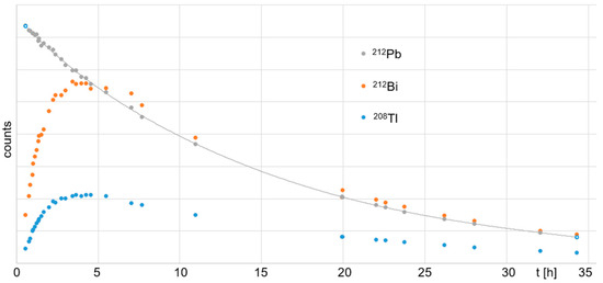 All isotopes of Pb were trapped by the Pb resin exclusively. The 212Pb eluate measured ~60% of the starting activity, where all nuclides were in equilibrium. All other nuclides, 224Ra, 212Bi, and 208Tl, were found in the waste elution, which measured ~40% of the starting activity. Therefore, the waste elution could be recycled and reused for further experiments within the following days. In Figure 7, the ingrowth of daughter nuclides over time for the Pb-resin-eluted 212Pb solution is shown, as is the radioactive decay of the initial 212Pb with a half-life of (10.7 ± 0.2) h. The residual eluate that was separated from the 212Pb by the Pb resin contained 224Ra, 212Bi, and 208Tl (Figure 8). 212Bi and 208Tl decayed initially, with their respective half-lives of t1/2 = 60.6 min and 3.1 min. At ~0.2 d (~4.8 h), their decay reached equilibrium with the newly formed 212Pb, which resulted from the 224Ra decay. 212Pb showed a typical ingrowth to equilibrium with its mother nuclide 224Ra over time. However, the 212Pb eluate showed a typical ingrowth of the daughter nuclides 212Bi and 208Tl up to equilibrium with their mother nuclide 212Pb (~4 h after Pb resin purification). This provides a method for the straightforward handling of waste by fast decay in storage.