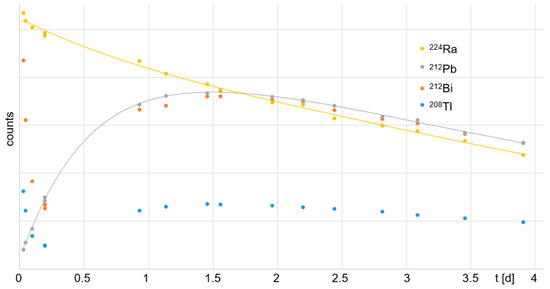 Curve of decay for residual 224Ra separated from 212Pb by resin and ingrowth of daughter nuclides within four days. The initial activity of the daughter nuclides 212Bi and 208Tl decreased significantly within the first 20 min because they are additional radionuclides obtained from the equilibrium state prior to elution and separation from 212Pb.