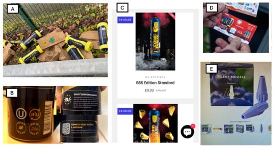 Extensive Distribution and Aggressive Marketing Strategies. (A) Current forms of nitrous oxide consumption: large cylinders containing the equivalent of several hundred small cartridges. (B) Marketing labels on nitrous oxide canisters: “Vegan,” “Halal,” “European Quality,” and a promotional game offering a trip to Amsterdam. (C) Sale and aggressive marketing of nitrous oxide via social media platforms. (D) Leaflet advertising for nitrous oxide sales, distributed in mailboxes. (E) Canister adapter designed to add flavor to nitrous oxide.