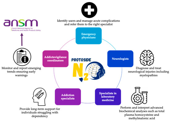 Nitrous oxide (N2O) was originally used for medical and industrial purposes, but its recreational use has dramatically increased, raising a major global public health concern. Chronic inhalation is associated with neurological, metabolic, and psychiatric complications, as well as addiction. To address these challenges, the PROTOSIDE network was developed to provide a multidisciplinary approach to management and prevention. This initiative relies on competence centers integrating specialists in emergency medicine, neurology, clinical biochemistry, and addiction medicine. PROTOSIDE aims to standardize diagnostic protocols, optimize patient care pathways, and strengthen addictovigilance. A strong emphasis is placed on prevention, including awareness campaigns and collaboration with healthcare professionals and educators. By facilitating access to advanced biochemical analyses (homocysteine, methylmalonic acid) and promoting international guidelines, PROTOSIDE represents an innovative model for a global response to N2O misuse. This integrated approach enhances clinical management, reduces complications, and harmonizes public health strategies.