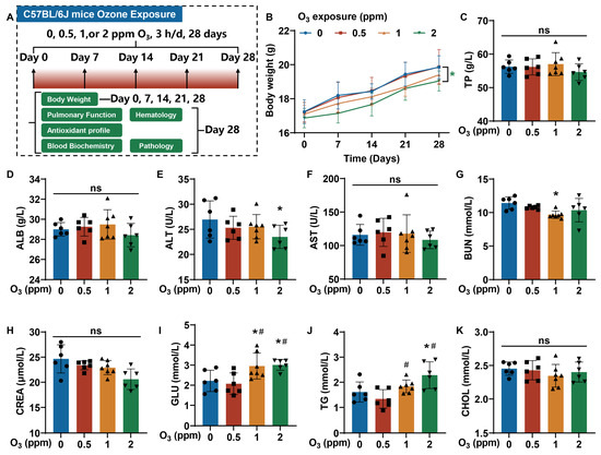 Figure 1. Changes in the body weights and serum biochemistry parameters of mice exposed to O3 for 28 days. Female C57BL/6J mice, aged 6–8 weeks, were exposed to 0, 0.5, 1, or 2 ppm O3 for 28 days (3 h/d). On the 7th, 14th, 21st, and 28th days, the body weights of mice were measured. After 28 days of O3 exposure, the mice were sacrificed, and their blood and organs were harvested. (A) A schematic illustration of the construction of the C57BL/6J mouse model with O3 exposure. (B) Changes in the body weights of mice. * Green, p < 0.05, 2 ppm vs. 0 ppm O3 exposure groups. (C) The blood concentrations of TP, (D) ALB, (E) ALT, (F) AST, (G) BUN, (H) CREA, (I) GLU, (J) TG, and (K) CHOL. The data are presented as means ± SD, n = 6. *, p < 0.05, compared with the 0 ppm O3 exposure group. #, p < 0.05, compared with the 0.5 ppm O3 exposure group. ns, non-significant.