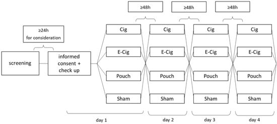 Flowchart and study design for each participant. Every device is tested once, whereas the order is randomly determined at the beginning of each measurement day (Cig—smoking a combustible cigarette; E-Cig—vaping an e-cigarette with tobacco flavor; Pouch—consumption of a nicotine pouch; Sham—vaping an e-cigarette without liquid as a control).