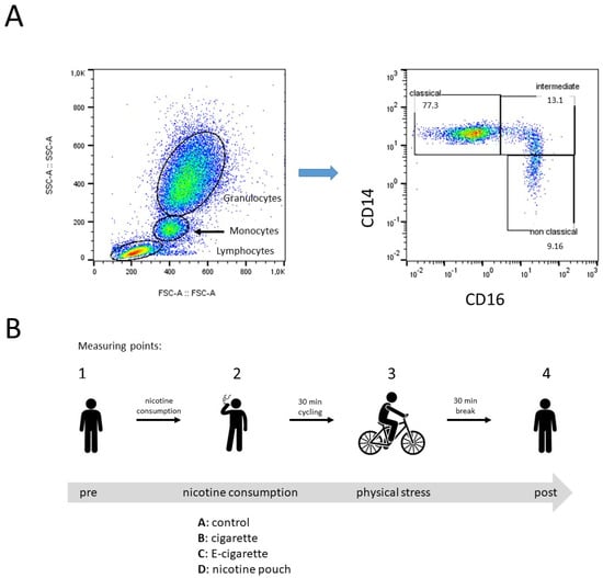 However, knowledge of the impact of tobacco smoke and different nicotine delivery systems (e.g., e-cigarettes, etc.) on the immunological cellular characteristics of human monocytes remains limited. Similarly, data on the effect on systemic inflammation after using a pouch are scarce, especially in direct comparison to combustible cigarettes, e-cigarettes, and sham vaping or smoking. In contrast, regular exercise can lower systemic inflammation associated with an increased release of myokines from skeletal muscle and a reduction of membrane-bound immune receptors involved in immune cell activity and release of inflammatory cytokines []. Moreover, it has recently been shown that interval exercise increases the abundance of circulating PD-1+ CD8 central memory T cells as well as soluble PD-L1 []. Immune checkpoint molecules PD-1 (programmed death-1) and PD-L1 (programmed death ligand-1) play a critical role in maintaining physiological health by downregulating inflammatory responses and maintaining immune system balance []. The independent interplay and contribution of all these processes on the individual immunologic situation is still not fully understood, especially in view of alternative nicotine delivery systems used for nicotine consumption, followed by physical exercise and a final resting phase on immunological responses regarding peripheral blood monocyte subsets. Therefore, we analyzed the distribution of circulating CD14/CD16 monocyte subsets as well as the expression of checkpoint molecule PD-L1 (programmed cell death ligand-1) using flow cytometry. Furthermore, expression patterns of a variety of different plasma cytokines were evaluated. The aim of this study was to increase our understanding of the temporal immunological responses to smoking, vaping, and physiological exercise, and their mutual interactions at the cellular level. Therefore, we hypothesize that different forms of acute nicotine consumption modulate the exercise-induced immune response of peripheral blood monocytes, particularly with respect to PD-L1 expression and monocyte subset distribution.