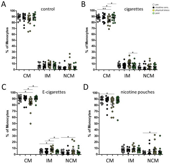 Flow cytometric analysis of peripheral blood monocyte subsets. Percentages of circulating classical (CM), intermediate (IM) and non-classical monocytes (NCM) in the peripheral blood of our cohort during the course of our study (pre; nicotine consumption; physical stress; post). The different parameters (A) control (consumption of nicotine free e-cigarette), (B) cigarette, (C) e-cigarette, and (D) pouch where investigated with regard to the measuring point ‘nicotine consumption’. *: p < 0.05; **: p < 0.01.