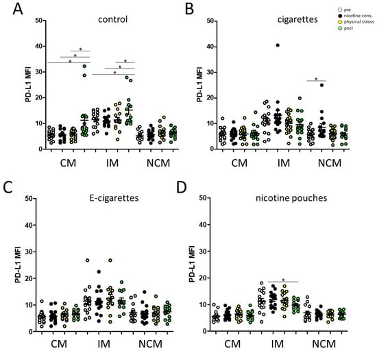 Checkpoint molecule PD-L1 on peripheral blood monocyte subsets (CM: classical monocytes; IM: intermediate monocytes; NCM: non-classical monocytes) during the course of our study (pre; nicotine consumption; physical stress; post). Different parameters (A) control (consumption of nicotine free e-cigarette), (B) cigarette, (C) e-cigarette, and (D) pouch were investigated with regard to the measuring point ‘nicotine consumption’, respectively. *: p < 0.05. MFI: mean fluorescence intensity.