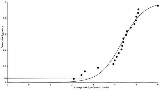 The species sensitivity distribution (SSD) method was proposed by the US EPA in 1978 for the derivation of aquatic life criteria and has been widely used in ERA []. Different from models of a single species combined with a single pollutant, the SSD method reflects the dose–response relationship of contamination and species by fitting an SSD curve, calculating HC5 (the concentration of pollutants harmful to 5% of the species), and constructing an SSD model []. Therefore, the SSD method analyzes the harm degree of different contaminations to different species from the perspective of the ecosystem, contributing to the evaluation of ecological risks.