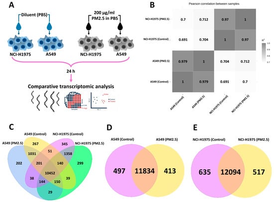 Global transcriptomic changes in NSCLC cell lines following PM2.5 exposure. (A) Experimental design showing acute PM2.5 exposure (200 µg/mL, 24 h) in A549 and NCI-H1975 cells. (B) Pearson correlation heatmap showing higher similarity within cell types than between treatments. (C) Venn diagram displaying shared and unique expressed genes across four groups (A549 control, A549 PM2.5-exposed, NCI-H1975 control, and NCI-H1975 PM2.5-exposed). (D,E) Gene overlap analysis showing shared and differentially expressed genes in A549 (D) and NCI-H1975 (E) following PM2.5 exposure.
