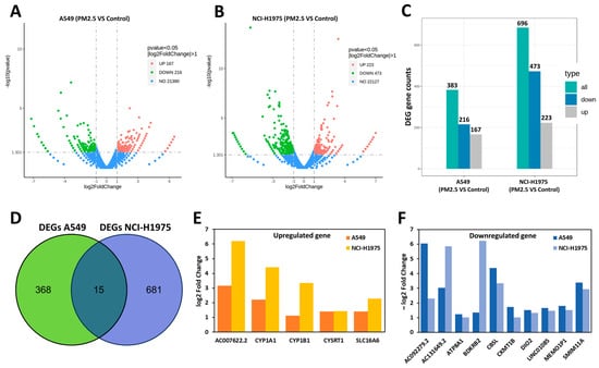 Analysis of differentially expressed genes (DEGs) and expression profiles in PM2.5-exposed A549 and NCI-H1975 compared to control. (A) Volcano plot showing DEGs in A549 cells exposed to PM2.5 versus untreated controls. (B) Volcano plot showing DEGs in NCI-H1975 cells exposed to PM2.5 versus untreated controls. Significantly upregulated (red) and downregulated (green) genes were identified using p-value ≤ 0.05 and |log2 fold change| ≥ 1.0 (grey dotted lines); non-significant genes are shown in blue. (C) Bar chart summarizing the number of total, upregulated, and downregulated DEGs identified in A549 and NCI-H1975 cells. (D) Venn diagram illustrating overlapping DEGs between the two cell lines. (E) Representative commonly upregulated genes in both cell lines, with their respective log2 fold change values. (F) Representative commonly downregulated genes in both cell lines, with their respective log2 fold change values.