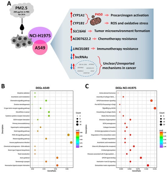 Functional impact of common differentially expressed genes (DEGs) and pathway enrichment analysis. (A) Potential effects of commonly DEGs in A549 and NCI-H1975 cells. (B,C) Pathway enrichment analysis of DEGs in A549 (B) and NCI-H1975 (C), highlighting key biological processes affected by PM2.5 exposure.