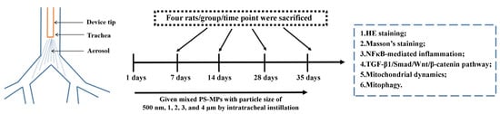 In basic research on MP inhalation in vivo, the duration of MP exposure has typically been relatively short, ranging from a few hours to a few days. Few studies have investigated the effects of long-term exposure to MPs via inhalation or intratracheal instillation on the lungs. The effects of long-term intratracheal administration of MPs with a mixed particle size on the degree of pulmonary fibrosis and the relationships between the structure and function of the mitochondria, pulmonary mitophagy, and mitochondrial dynamics are still not completely clear.