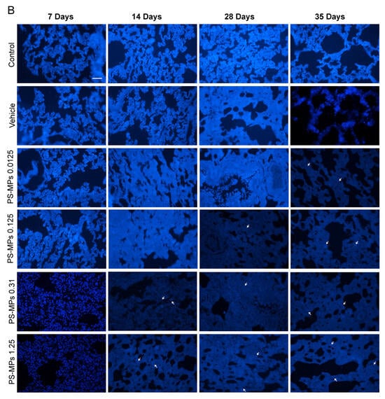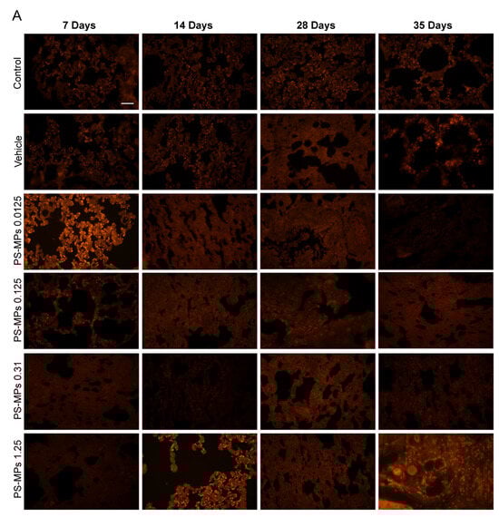 After 7, 14, 28, and 35 days of exposure, we observed the distribution of PS-MPs at three excitation wavelengths (red fluorescence, 548 nm; blue fluorescence, 383 nm; green fluorescence, 484 nm). No PS-MPs were detected in the lung tissues of the rats in the control and vehicle groups; in contrast, many 1 to 4 µm PS-MPs were detected in the lungs of the rats in the PS-MP exposure groups (Figure 2B,C); no 500 nm PS-MPs were detected in the lungs (Figure 2A). However, the fluorescence microscope we used has limited magnification capability, and, in subsequent experiments, we should use a confocal laser microscope to reconfirm this result. The number of PS-MPs in the rat lungs was greater in the 1.25 mg PS-MP exposure group than in the low-dose PS-MP exposure group, and the number of 3 µm and 4 µm PS-MPs was greater than the number of 1 µm and 2 µm PS-MPs.