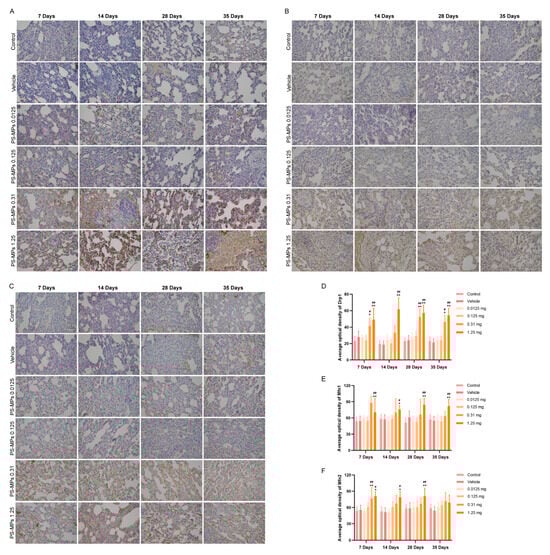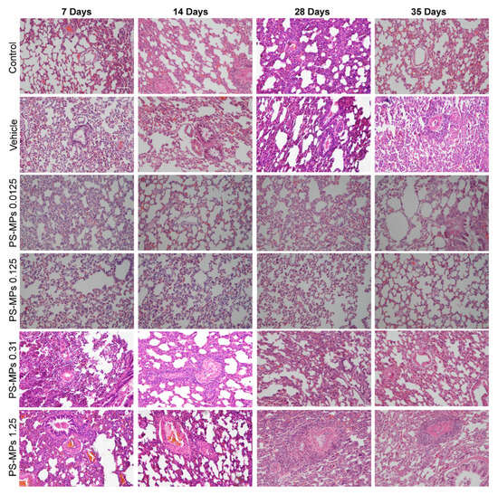 The lung structure in the different treatment groups was evaluated using HE staining. The alveolar structure was intact in the control, vehicle, 0.0125 mg PS-MP, and 0.125 mg PS-MP groups, the alveolar wall was thin and clear, and the alveolar cavity did not collapse (Figure 4). However, the alveolar structure was irregular in the 0.31 mg and 1.25 mg PS-MP groups; the alveolar wall was thickened, the alveolar cavity collapsed, and there was a large amount of inflammatory cell infiltration (Figure 4). In particular, after 28 and 35 days of exposure to PS-MPs, larger areas of fibrous scars and more severe inflammatory cell infiltration were observed in the lungs of the rats in the 1.25 mg PS-MP group than in those of the rats in the low PS-MP group, indicating that as the PS-MP exposure duration and dose increased, the structural damage to the lungs gradually worsened (Figure 4).