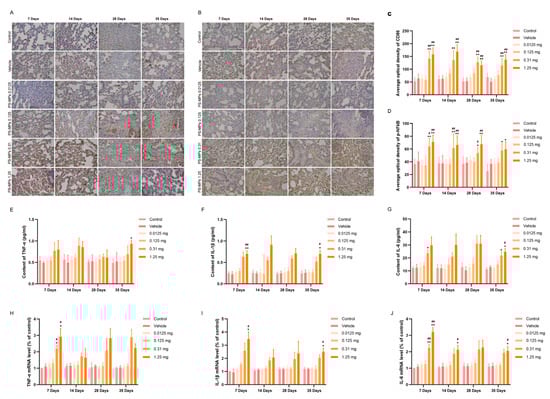 CD86 is a biomarker for M1 macrophages, which secrete proinflammatory cytokines that bind to their receptors and then activate IκBα and phosphorylated IκBα. Nuclear factor κB (NFκB) can be released from the NFκB/phospho inhibitor of κBα (IκBα) complexes, leading to its nuclear translocation; this further promotes the release of proinflammatory cytokines, which can promote the acquisition of the fibroblast phenotype by epithelial cells or endothelial cells []. Phosphorylated NF-κB promotes the nuclear translocation of p50/p65 and p65 NF-κB; therefore, the phosphorylation of NF-κB can be used as an indicator of nuclear transcription levels [,,]. The results revealed that the expression levels of CD86 and p-NFκB were significantly greater in the lungs of rats in the 0.31 mg/kg and 1.25 mg/kg PS-MP group than in those of the control and vehicle groups, with the highest expression occurring at 7 and 14 days of exposure (Figure 5A–D). However, the difference in the expression of CD86 and p-NFκB between the 0.31 mg and 1.25 mg PS-MP groups was minimal. Compared with those in the control and vehicle groups, the protein and mRNA levels of TNF-α, IL-1β, and IL-6 in the low PS-MP (0.0125 mg and 0.125 mg) exposure groups showed little change (Figure 5E–J). In the high PS-MP (0.31 mg and 1.25 mg) exposure groups, the protein and mRNA levels of TNF-α, IL-1β, and IL-6 clearly increased, especially on the 7th day and 35th day after exposure to PS-MPs (Figure 5E–J). The peak proinflammatory cytokine levels were detected on the 7th day after exposure to PS-MPs, which indicated that proinflammatory cytokines may be sensitive indicators of lung injury.