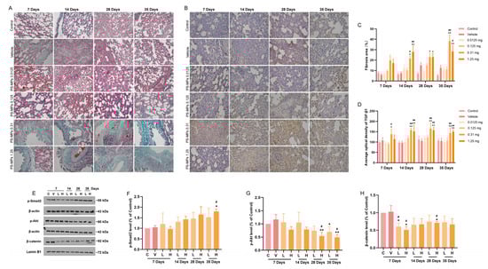 Intratracheal administration of PS-MPs induced pulmonary fibrosis in rats. Masson’s trichrome staining revealed green collagen deposition in the rat lungs (A,C). The expression levels of TGF-β1 (B,D) and p-Smad2 (E,F) increased, and the expression levels of p-Akt (E,G) and nuclear β-catenin (E,H) decreased in the lungs of the rats in the PS-MP exposure groups. Abbreviations for WB analysis are C: control, V: vehicle, L: 0.31 mg PS-MPs, H: 1.25 mg PS-MPs. All the results are expressed as the mean ± SD; n = 4. * p < 0.05, ** p < 0.01 vs. the control group; # p < 0.05, ## p < 0.01 vs. the vehicle group; bar = 100 μm.