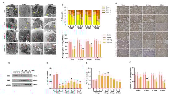 The mitochondria were extracted from the lungs to measure the ATP, microtubule-associated protein light chain 3 (LC3), and autophagosome substrate sequestosome-1 (SQSTM1/p62) contents. PINK1/Parkin is the main signaling pathway that mediates mitophagy []. The expression of LC3Ⅱ (Figure 8C,D) and PINK1 (Figure 8G,H) and the ATP content (Figure 8F) were significantly reduced in the lungs of the PS-MP exposure groups, but the expression of P62 was significantly increased (Figure 8C,E). As the PS-MP exposure duration increased, the changes in LC3Ⅱ, P62, ATP, and PINK1 expression differed from those observed after exposure to PS-MPs for 7 days, and the expression of LC3Ⅱ slightly increased after exposure to PS-MPs for 28 days (Figure 8D). The P62 level first increased significantly, but then decreased gradually (Figure 8E), and the ATP content gradually decreased (Figure 8F). Compared with the results for the exposure to PS-MPs for 7 days, the expression of PINK1 gradually increased after exposure to PS-MPs for 28 and 35 days (Figure 8H).