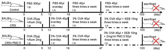 To ensure experimental validity and reproducibility, stringent environmental controls were implemented throughout the study. All mice were kept in a standard SPF animal laboratory (Chongqing, China). The control group was maintained under normal, clean air conditions, while the experimental groups were exposed to varying concentrations of PM2.5. To develop a PM2.5-induced CRS mouse model, 4-week-old female BALB/c mice were sensitized with intraperitoneal Ovalbumin (OVA)/alum on days 0 and 5, followed by nasal OVA challenges from days 12–103. From day 47, selected mice received additional intranasal SEB plus PM2.5 exposure (3× weekly). This protocol combined allergic sensitization (OVA), bacterial toxin-induced inflammation (Staphylococcal Enterotoxin B (SEB)), and pollutant exposure (PM2.5) to mimic human CRS pathogenesis. Tissues were collected 24 h post-final exposure for analysis (Figure 1).