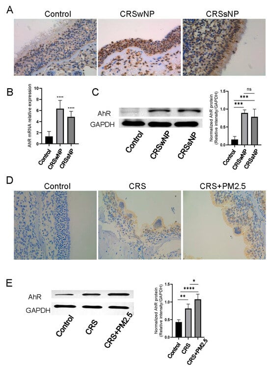 AhR Activation in CRS. (A) Immunohistochemistry staining of AhR in human nasal mucosal epithelium tissue sections revealed AhR expression, with significantly higher expression levels observed in CRS (including CRSwNP and CRSsNP) compared with control (×400 magnification). (B) mRNA expression of AhR in human nasal mucosal epithelium. The graph demonstrates elevated AhR expression in the CRS group (including CRSwNP and CRSsNP) relative to control. (C) Protein expression of AhR in human nasal mucosal epithelium. The bar chart indicates statistically significant upregulation of AhR in CRSwNP and CRSsNP compared with control, with CRSwNP showing higher expression than CRSsNP. (D) Immunohistochemistry staining of AhR in mouse nasal epithelium demonstrated strong AhR expression in both CRS and CRS + PM2.5 groups compared with control. (E) Western blot analysis confirmed significantly higher AhR expression in CRS and CRS + PM2.5 groups compared with control, with CRS + PM2.5 exhibiting greater expression than CRS, showing statistical significance. * p < 0.05, ** p < 0.01, *** p < 0.001, **** p < 0.0001; “ns” indicates no statistical significance.