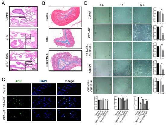 HE staining of the mouse model confirmed the presence of nasal polypoid changes in both the CRS and CRS + PM2.5 groups, with more severe pathological alterations observed in the CRS + PM2.5 group, under the upregulated expression of AhR (Figure 3A). Masson trichrome staining further demonstrated pathological destruction and abnormal collagen fiber proliferation in the nasal mucosal epithelium, consistent with tissue remodeling (Figure 3B). Moreover, IF staining of AhR was performed in HNEpCs to verify its expression and localization. The results revealed higher AhR expression in HNEpCs from both CRSwNP and CRSsNP groups, with AhR predominantly localized in the nucleus (Figure 3C), indicating its activated state in CRS. The growth and migration of HNEpCs were assessed using a scratch assay at 0, 12, and 24 h, with or without the AhR inhibitor CH223191. The results showed that HNEpCs from the CRSwNP and CRSsNP groups migrated faster than control, with cells adopting a long spindle-shaped morphology over time. Additionally, the migration speed of HNEpCs was significantly reduced in the presence of CH223191 (Figure 3D).