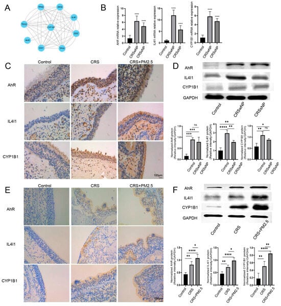 IL4I1-Mediated AhR Activation in CRS Pathogenesis. (A) A protein–protein interaction network. (B) mRNA expression of AhR, IL4I1, and CYP1B1 in human nasal mucosal epithelium. The graph depicts that AhR, IL4I1, and CYP1B1 all had higher expressions in the CRS group (including CRSwNP and CRSsNP). (C) Immunohistochemistry staining of AhR, IL4I1, and CYP1B1 in human nasal mucosal epithelium tissue sections. The figure shows the staining of AhR, IL4I1, and CYP1B1 expressed in human nasal mucosal epithelium, and the expressions of AhR, IL4I1, and CYP1B1 were all higher in CRS (including CRSwNP and CRSsNP) than those in control (×400 magnification). (D) Protein expression of AhR, IL4I1, and CYP1B1 in human nasal mucosal epithelium. The bar chart shows the statistically significant upregulation of AhR, IL4I1, and CYP1B1 in CRSwNP and CRSsNP compared with control, with IL4I1 expression higher in CRSwNP than in CRSsNP. (E) Immunohistochemistry staining of AhR, IL4I1 and CYP1B1 in mouse nasal epithelium. The results clearly depict that AhR, IL4I1, and CYP1B1 were strongly expressed in CRS and CRS + PM2.5 compared with control. (F) Western blot analysis of protein expression in mouse nasal epithelium. AhR, IL4I1, and CYP1B1 were significantly upregulated in CRS and CRS + PM2.5 groups compared with control, with higher expression in CRS + PM2.5 than in CRS. * p < 0.05, ** p < 0.01, *** p < 0.001, **** p < 0.0001, and “ns” is for no statistically significant.