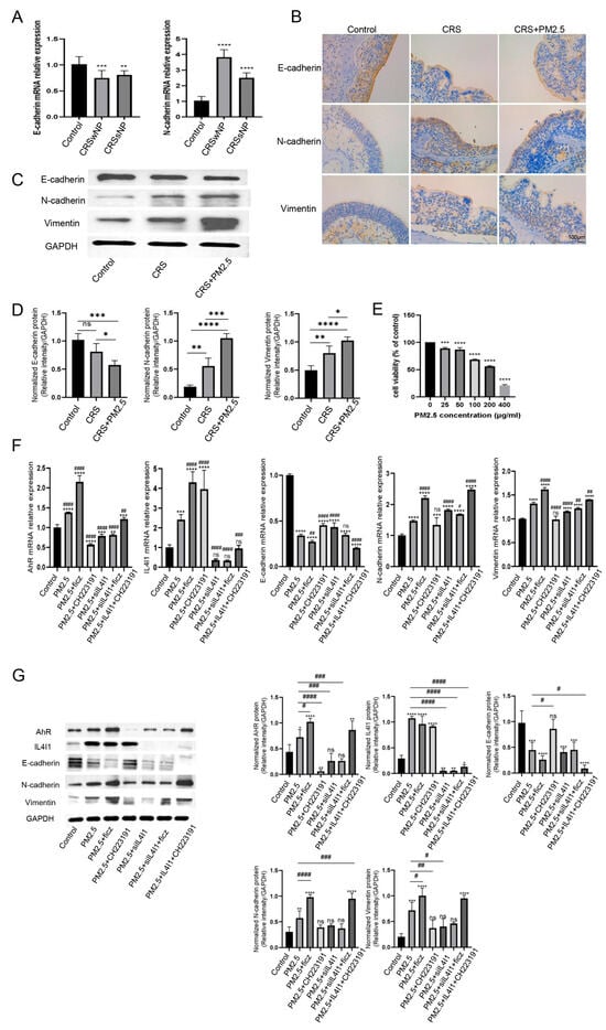 PM2.5-Induced IL4I1-AhR Signaling Drives Epithelial–Mesenchymal Transition in CRS. (A) mRNA expression of E-cadherin and N-cadherin in human nasal mucosal epithelium. E-cadherin was downregulated in CRSwNP and CRSsNP compared with control, while N-cadherin was upregulated. (B) Immunohistochemistry staining of epithelial–mesenchymal transition (EMT) markers (E-cadherin, N-cadherin, and vimentin) in mouse models. E-cadherin expression was weak in CRS and CRS + PM2.5 compared with control, while N-cadherin and vimentin were strongly expressed. (C,D) Western blot analysis of protein expression in mouse nasal epithelium. E-cadherin levels were significantly lower in CRS and CRS + PM2.5 compared with control, while N-cadherin and vimentin levels were higher. Differences between CRS and CRS + PM2.5 were statistically significant. (E) Determination of the optimal PM2.5 concentration for stimulating human nasal epithelial cells (200 μg/mL PM2.5 inhibited cell growth, reducing cell viability to approximately 50%). (F) qRT-PCR and (G) Western blot analysis of mRNA levels and protein expression of AhR, IL4I1, E-cadherin, N-cadherin, and vimentin. * p < 0.05, ** p < 0.01, *** p < 0.001, **** p < 0.0001, compared with the control; # p < 0.05, ## p < 0.01, ### p < 0.001, #### p < 0.0001, compared with PM2.5; and “ns” is for no statistically significant.