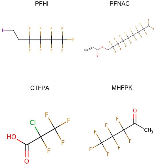 Structure of 1H,1H,9H-perfluoronyl acrylate (PFNAC), 1H,1H,2H,2H-perfluorohexyliodide (PFHI), 2-chlorotetrafluoropropionic acid (CTFPA), and 3,3,4,4,5,5,5-heptafluoropentan-2-one (MHFPK). The figures are from the US EPA CompTox Chemicals Dashboard (https://comptox.epa.gov/dashboard/, accessed on 22 May 2025).