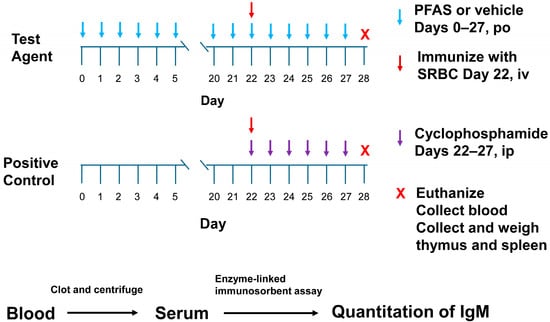 This study followed the methods outlined in the US EPA Health Effects Test Guideline OPPTS 870.7800 Immunotoxicity []. The studies were performed in a block design, wherein each block used one test chemical along with positive and vehicle control groups. A workflow of the experimental assay is shown in Figure 2. Male rats (N = 12/dose group) were dosed daily with vehicle or a PFAS test chemical via oral gavage on Days 0–27 (28 consecutive days) (Table 1). (Note, in the 200 mg/kg/day PFHI dose group, N = 11. One rat in this group was mis-dosed over the course of 4 days. It was decided to remove this animal from this study.) The test guideline states that either sex may be used in this assay. It further states that if one sex is more sensitive or believed to be more sensitive, then that sex should be used. For PFASs, there is a general trend indicating that male rodents are more sensitive than female rodents to the toxic effects of these chemicals. Based on this trend, male rats were chosen as the test model. The administered doses were as follows: PFHI, 0, 12.5, 25, 50, 100, and 200 mg/kg/day; PFNAC, 0, 0.1, 0.3, 1, 3, and 10 mg/kg/day; CTFPA, 0, 1.9, 3.8, 7.5, 15, and 30 mg/kg/day; MHFPK, 0, 18.8, 37.5, 75, 150, and 300 mg/kg/day. The doses were based on previous 14-day oral repeat dose range-finding studies []. Although there were no effects on survival or body weight of the male rats administered the 4 PFASs over the course of 14 days, dose-dependent increases in liver weight were observed for PFNAC, PFHI, and CTFPA. Individual dose volumes were calculated based on the weekly body weight by each animal. Test substance formulations were stirred for at least 30 min prior to dosing and continuously during dosing. The positive control group was treated once daily with 15 mg/kg cyclophosphamide monohydrate in saline via intraperitoneal injection on Days 22–27. SRBCs were suspended in sterile phosphate-buffered saline and administered intravenously via the tail vein on Day 22 in a volume of 0.5 mL at a concentration of 4 × 108 SRBCs/mL (dose of 2 × 108 SRBCs/rat). Test article and cyclophosphamide were administered after immunization with the SRBCs.