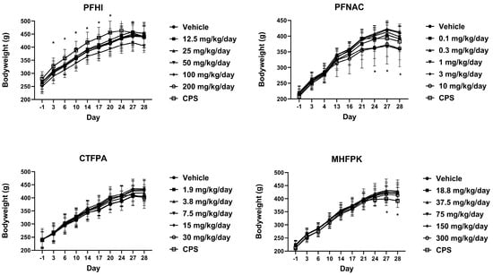 Mean group body weights of rats dosed by oral gavage daily from Day 0 to 27 with PFHI, PFNAC, CTFPA, or MHFPK. The vehicle control was corn oil. The positive control rats were administered CPS in sterile saline by intraperitoneal injection on Days 22–27. The rats were administered the antigen SRBC iv on Day 22. The rats were euthanized on Day 28. The data represent mean ± SD, N = 12/dose group, except for the 200 mg/kg/day PFHI dose group, N = 11. * Significantly different from the vehicle control, p < 0.05.