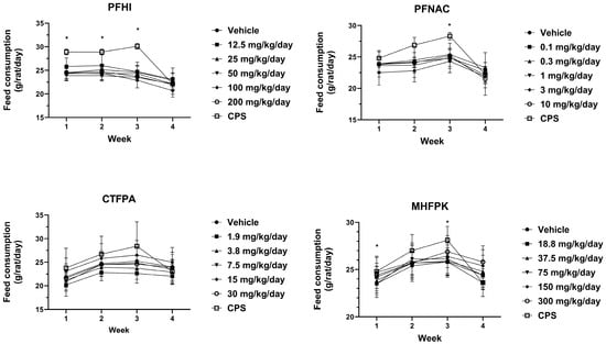 Mean feed consumption of rats dosed by oral gavage daily from Day 0 to 27 with PFHI, PFNAC, CTFPA, or MHFPK. The vehicle control was corn oil. The positive control rats were administered CPS in sterile saline by intraperitoneal injection on Days 22–28. The rats were administered the antigen SRBC iv on Day 22. The rats were euthanized on Day 28. The data represent mean ± SD, N = 12/dose group, except for the 200 mg/kg/day PFHI dose group, N = 11. * Significantly different from vehicle control, p < 0.05.