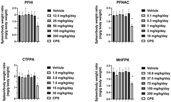 Spleen/body weight ratio of rats dosed by oral gavage daily from Day 0 to 27 with PFHI, PFNAC, CTFPA, or MHFPK. The vehicle control was corn oil. The positive control rats were administered CPS in sterile saline by intraperitoneal injection on Days 22–28. The rats were administered the antigen SRBC iv on Day 22. The rats were euthanized on Day 28. The data represent mean ± SD, N = 12/dose group, except for the 200 mg/kg/day PFHI dose group, N = 11. * Significantly different from the vehicle control, p < 0.05.