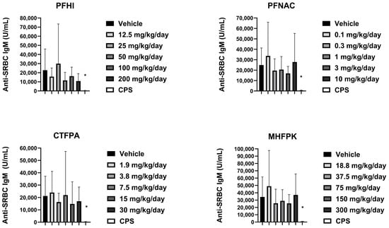 Serum anti-SRBC IgM response of rats dosed by oral gavage daily from Day 0 to 27 with PFHI, PFNAC, MHFPK, or CTFPA. The vehicle control was corn oil. The positive control rats were administered CPS in sterile saline by intraperitoneal injection on Days 22–28. The rats were administered the antigen SRBC iv on Day 22. The rats were euthanized on Day 28. The data represent mean ± SD, N = 12/dose group, except for the 200 mg/kg/day PFHI dose group, N = 11. * Significantly different from vehicle control, p < 0.05.