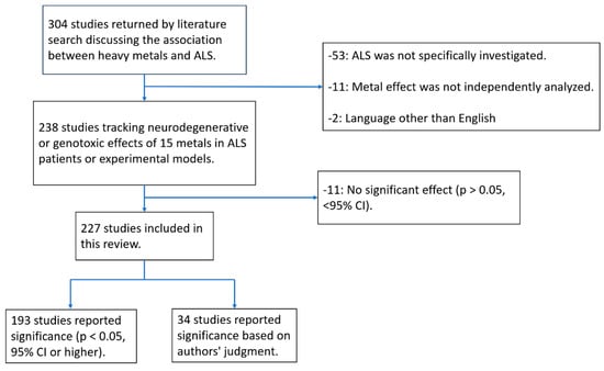A total of 304 studies investigating the relationship between exposure to 15 metals and outcomes in ALS patients or ALS models were initially identified. After excluding studies that did not specifically investigate ALS (53 studies), did not independently analyze metal effects (11 studies), or were written in languages other than English (2 studies), 238 studies remained for review. Of these, 11 studies reported no significant association between metals and ALS, leaving 227 studies that met the criteria for inclusion (Figure 1).
