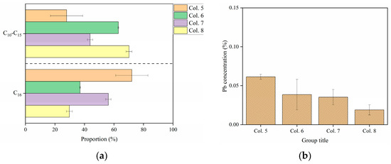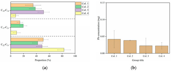 The content of (a) C10−C16 and (b) Pb in the leachate. The leachate was collected only after the 3rd leaching process. The values shown are means ± standard deviation (n = 3). The concentration of Cd in the leachates was below detection limits and, therefore, not recorded.