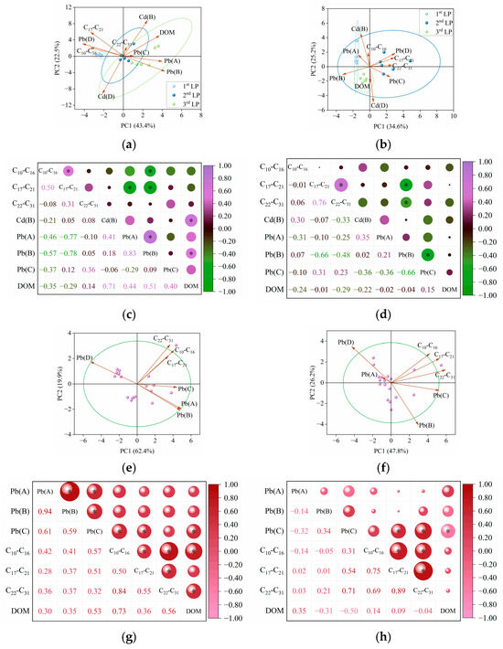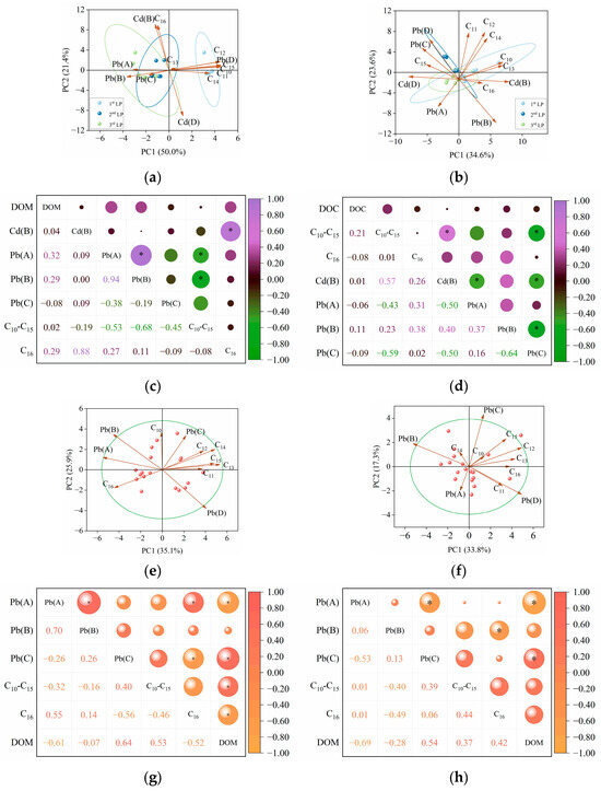 PCA and Pearson correlation analysis. (a,b) PCA for Col. 1 and Col. 2. (c,d) Pearson correlation analysis for Col. 1 and Col. 2. (e,f) PCA for Col. 3 and Col. 4. (g,h) Pearson correlation analysis for Col. 3 and Col. 4. The capital letters A, B, C, and D represent the exchangeable, reducible, oxidizable, and residual fractions of Cd/Pb. PC1 and PC2 account for the dataset. The significance of the correlations (*) is evaluated at the p < 0.05 level. DOM: dissolved organic matter.
